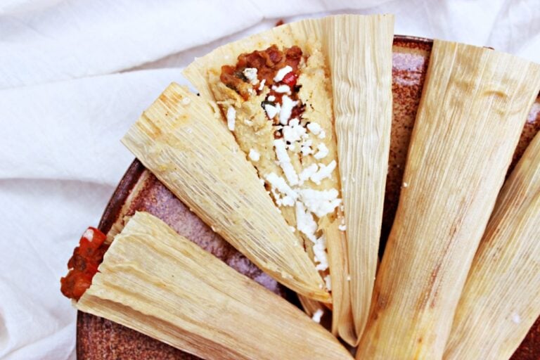 Tips: Don’t rush the process or you’ll get frustrated. Leave yourself a half day to make these. Make a few dozen and freeze them to steam later since you’ll have several corn husks in your package. Depending on how big or small your corn husks are, your filling may go further. You can substitute vegetable shortening for regular shortening and butter to make this vegan.